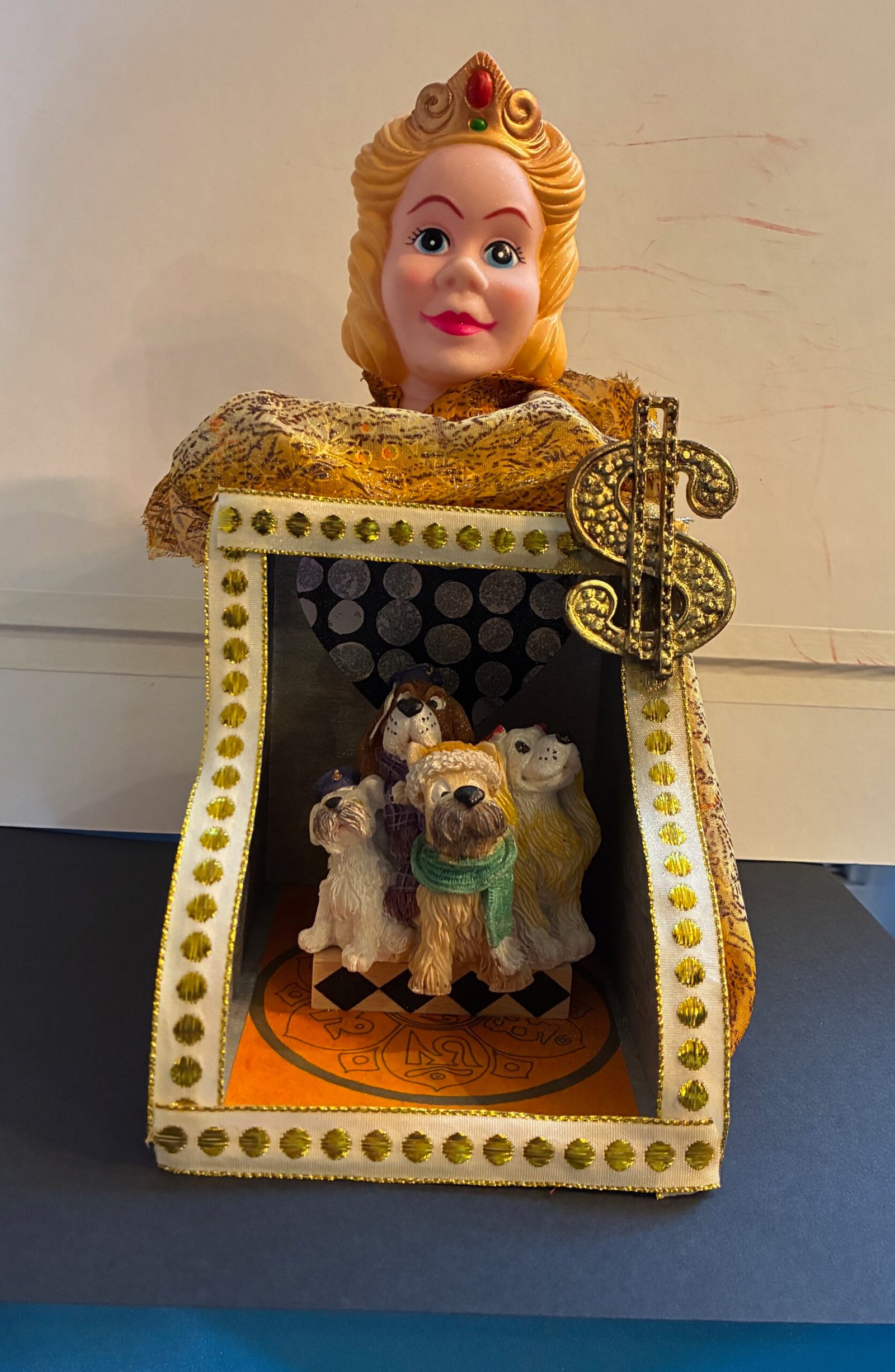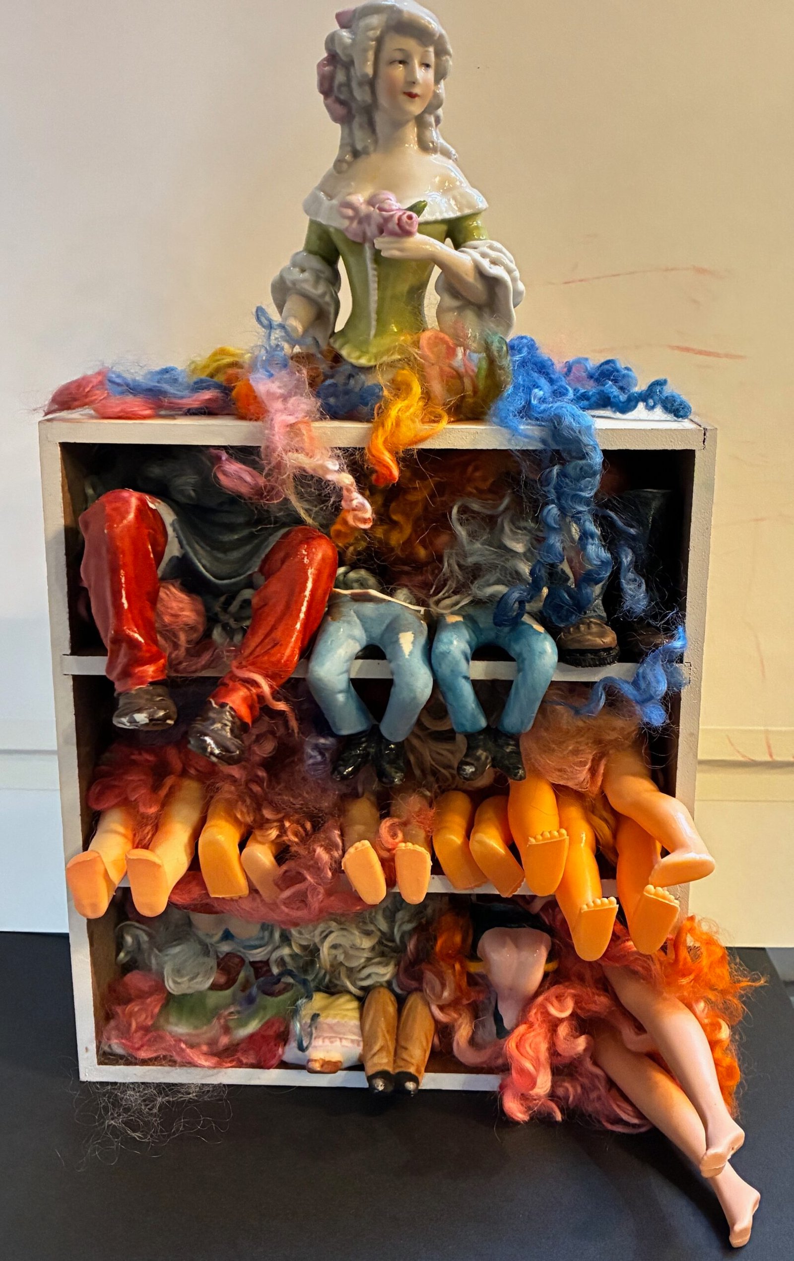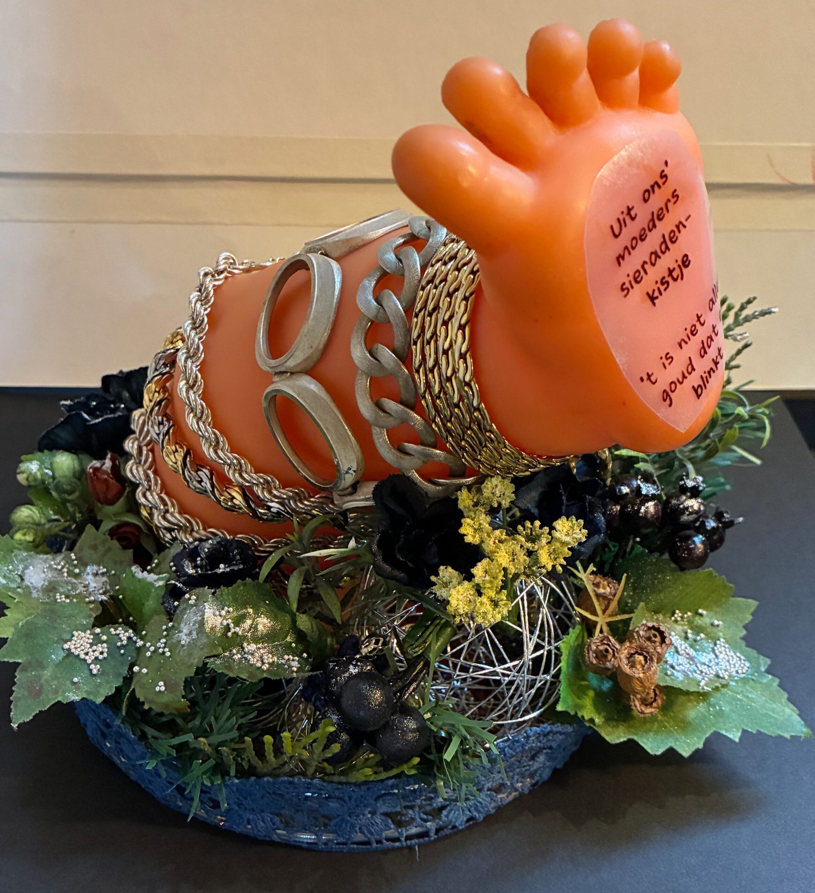 Houten mal voor bakstenen met “afval” van de tandarts’.